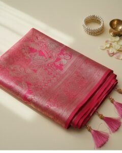Elegant Rose Pink Banarasi Silk Saree with Zari Weave & Stone-Embellished Pallu
