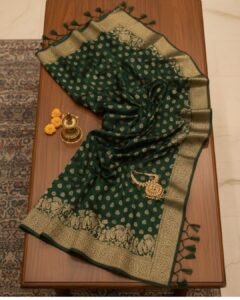 Dark Green Banarasi Silk Saree with Antique Gold Zari Weaving & Royal Elephant Pallu – Traditional Wedding & Festive Wear Saree for Women