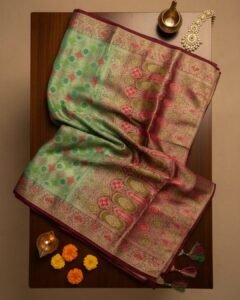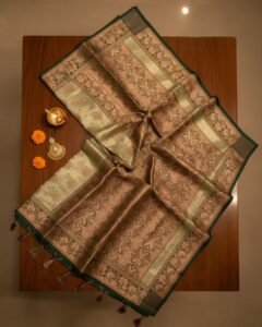 Elegant Sage Green Banarasi Silk Saree with Antique Gold Zari Work