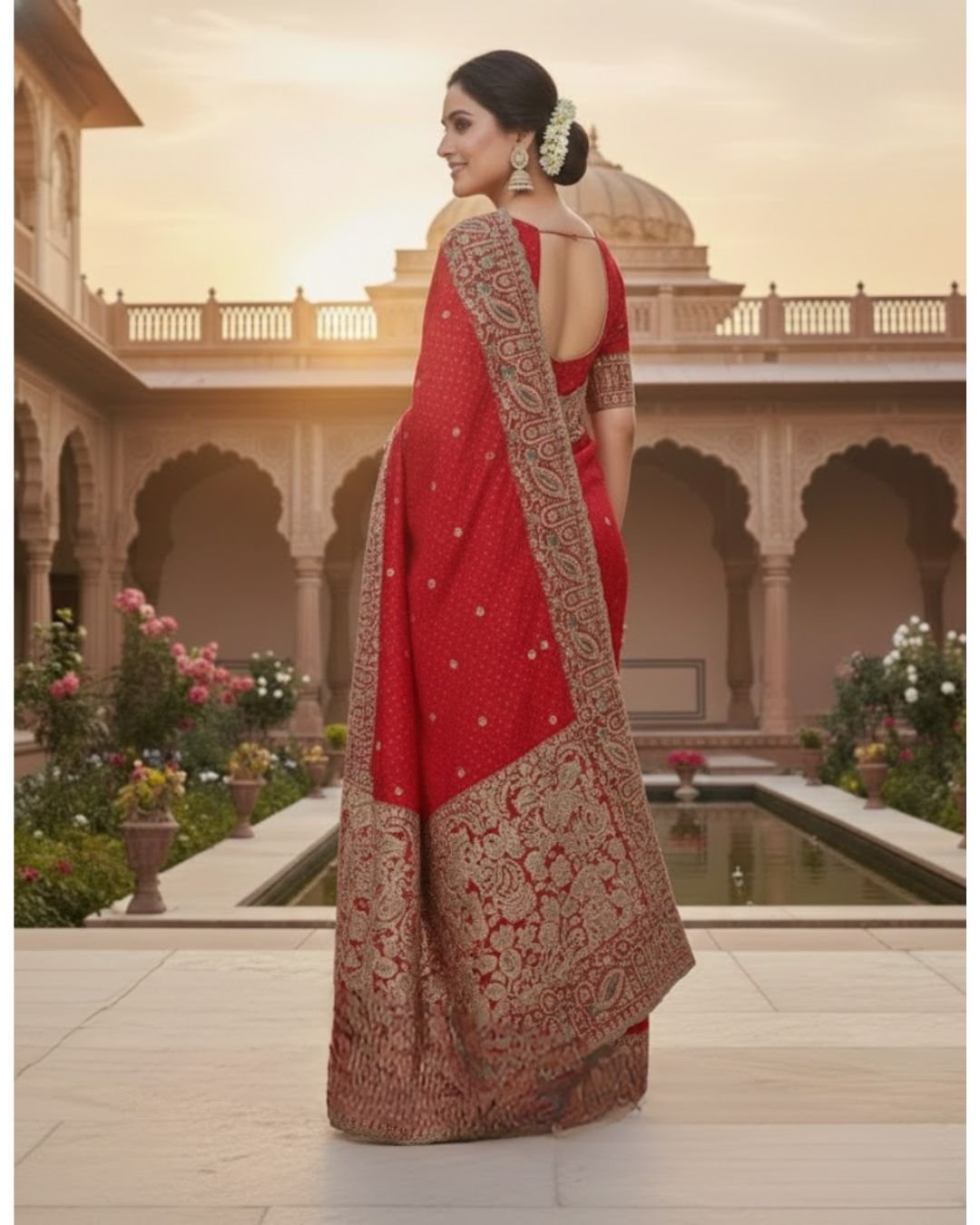 Product Name: Red Banarasi Silk Saree with Heavy Gold Zari Border
