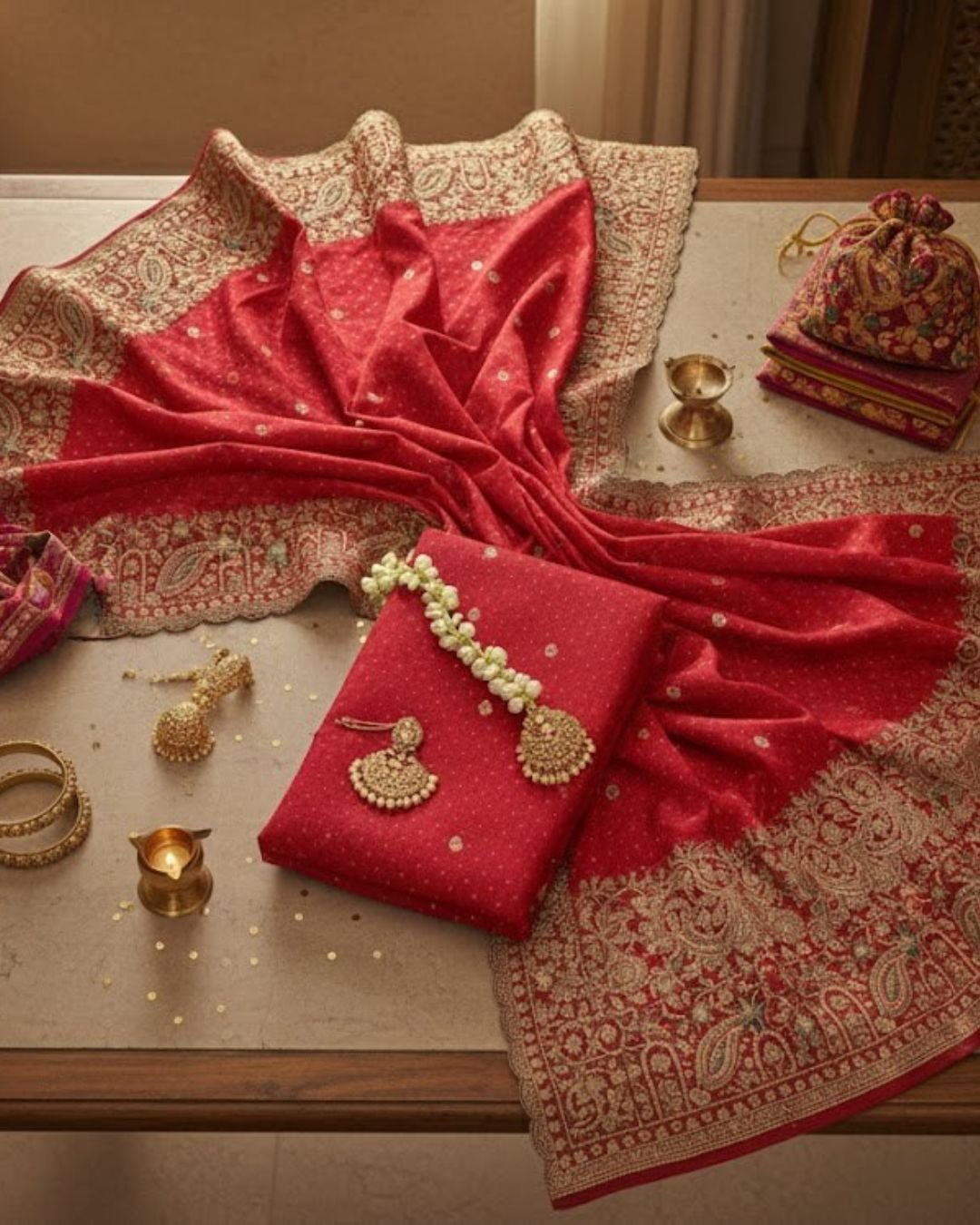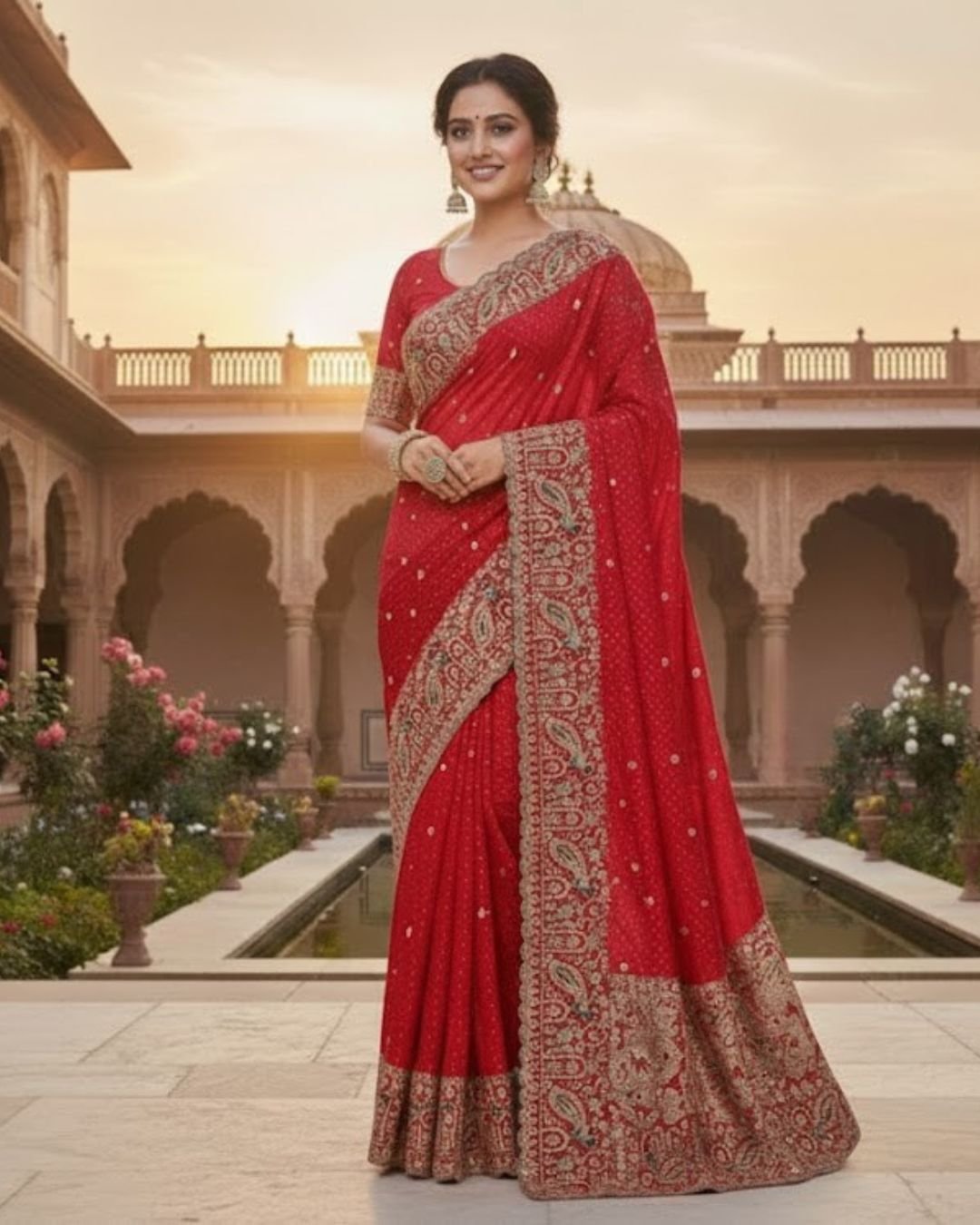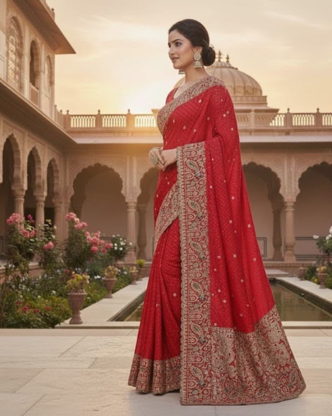 Red Banarasi Silk Saree with Heavy Gold Zari Border – Wedding & Festive Wear