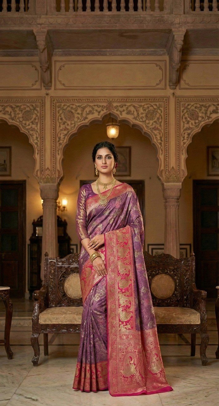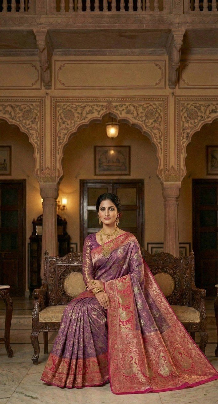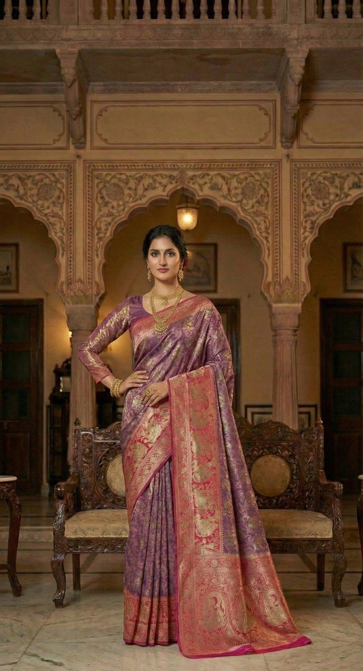 Elevate your ethnic wardrobe with this exquisite Royal Banarasi Silk Saree, a timeless masterpiece that reflects heritage craftsmanship and regal elegance. Woven in a rich mauve purple hue, this saree is adorned with intricate antique gold zari motifs inspired by traditional Mughal florals and paisley patterns.
