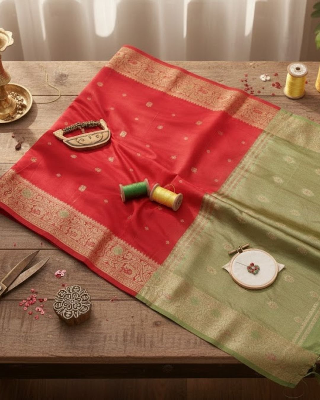 Royal Red & Sage Green Banarasi Silk Saree with Antique Gold Zari Border