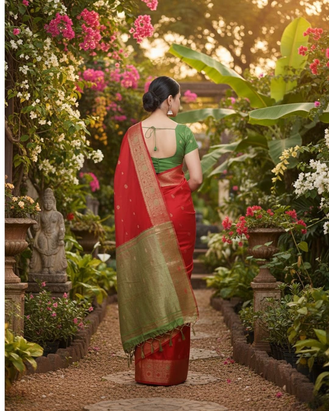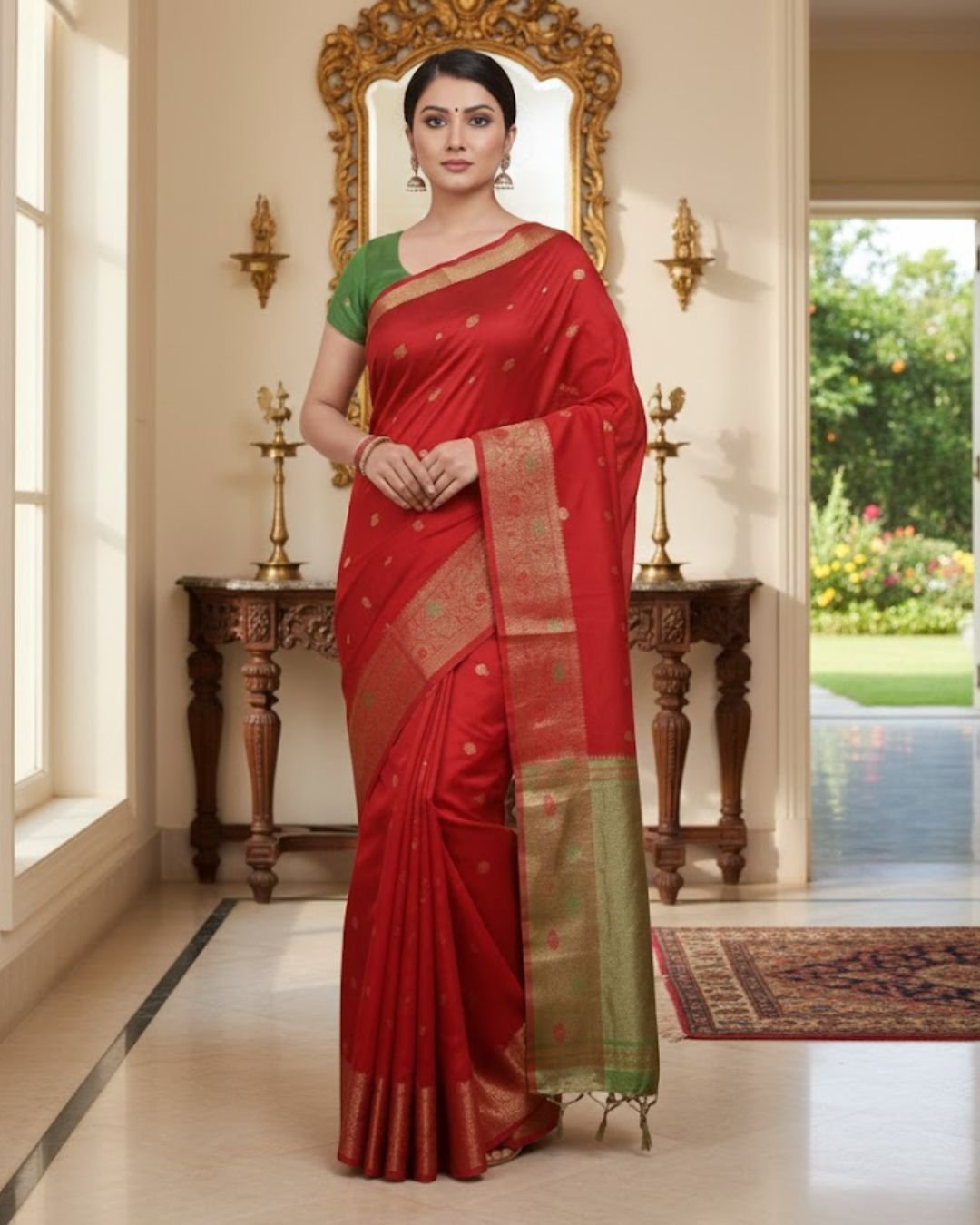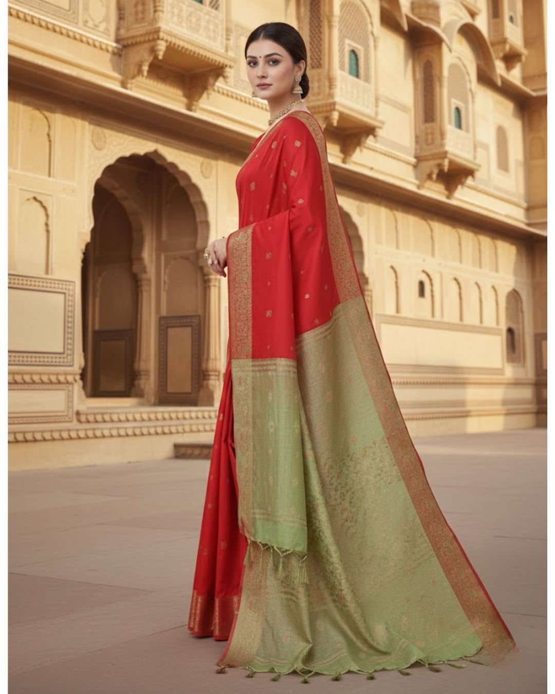 Saree Color: Royal Red with Sage Green Contrast